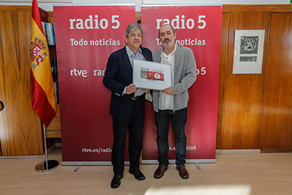 Antonio Mayor Villa, director de Comunicación del Grupo Social ONCE, ha entregado a Fernando Martín, director de Radio 5, una lámina enmarcada con este cupón en la Casa de la Radio.