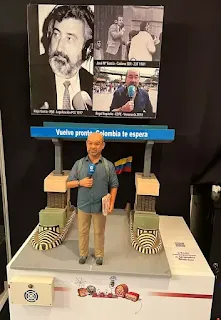 Imagen: Se puede apreciar una imagen de Ángel Expósito delante del puente Simón Bolívar y una escultura del periodista de la COPE, con el ABC, del que fue director, sobre las rodillas, y su tradicional micrófono.