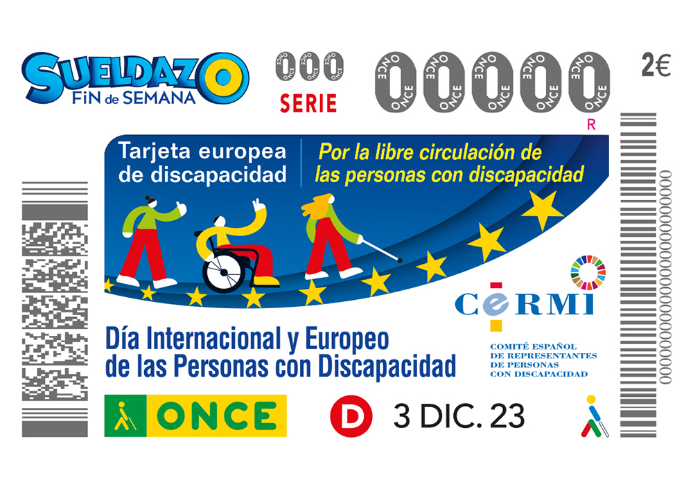 El cupón del 3 de diciembre reivindica la urgente puesta en marcha de la Tarjeta Europea de Discapacidad por parte de la Comisión Europea, una decisión que el Grupo Social ONCE apoyó el pasado septiembre, tras la reunión del Colegio de Comisarios.